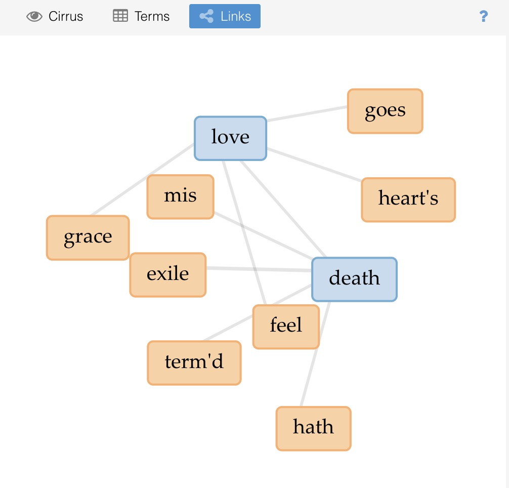 - Click on any word in the Cirrus cloud to filter the other tools — the fact that they are connected provides a lot of exploratory data viz power.