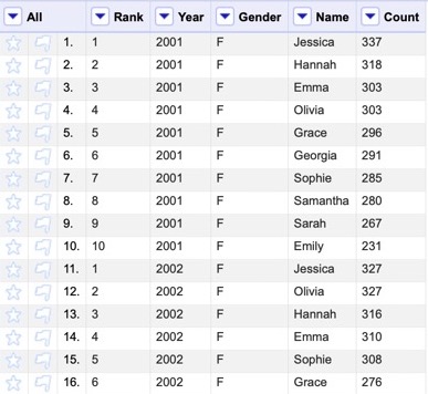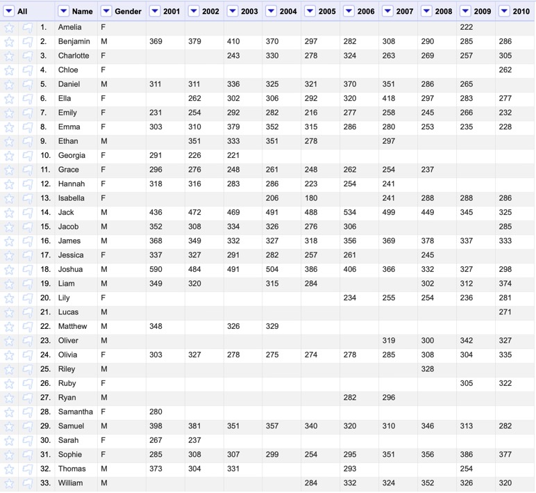This template wants a dataset with a row for each participant in the race (in this case, each name) with a first column containing the Label, optional Categories (e.g. gender), and each subsequent column representing a “stage” of the race (e.g. a year) that holds the Values (e.g. counts).