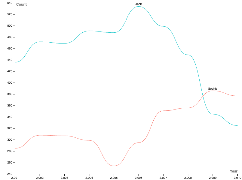 Knowing the high approval and usage of the names Jack and Sophie. I wanted to see how their usage fluctuated over their ten years of data. So, I created a line graph that visualizes the number of babies given the name Jack or Sophie in a corresponding year. From this, we can see trends that could suggest cultural shifts. It appears that the names Jack and Sophie had opposing trends, despite similarly good average rankings throughout the decade. In the early 2000s, the name Jack became more and more popular until 2006, where it then peaked and declined in usage. In contrast, the name Sophie was down trending until 2005, where its usage then increased over the next 5 years.